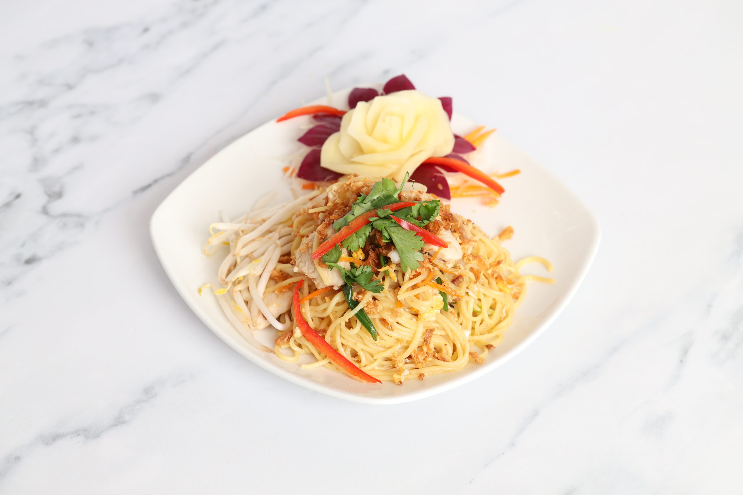 Stir-fried Egg Noodles with chili, garlic, Onion, peppers, black pepper, and Thai herb, with your choice of meat.