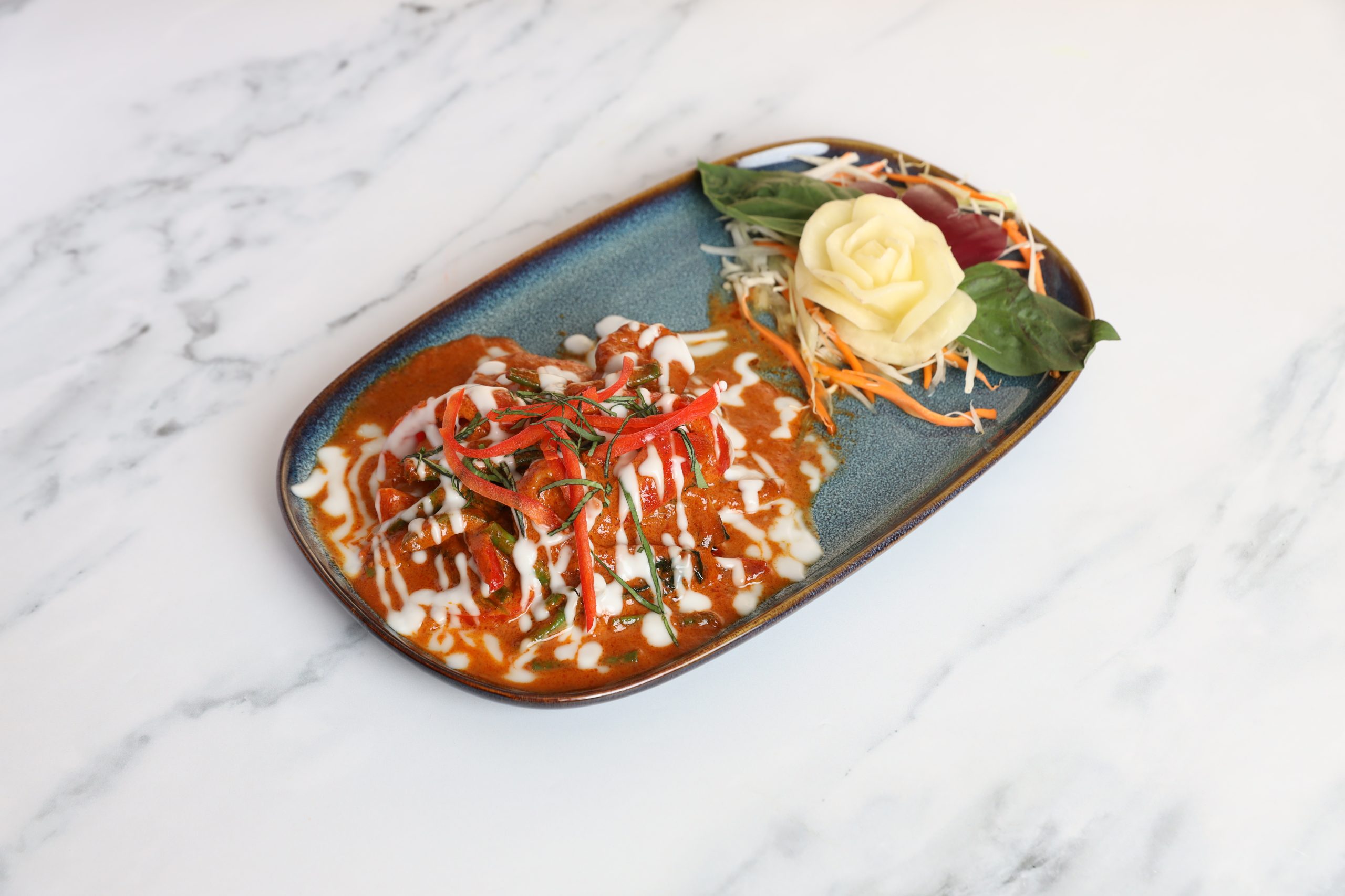 Slow cooked in a rich Panang curry sauce with sweet coconut milk, garnished with shredded kaffir lime leaves, fine bean, green , red peppers and sweet basil your choice of meat (Spicy to Medium Hot)