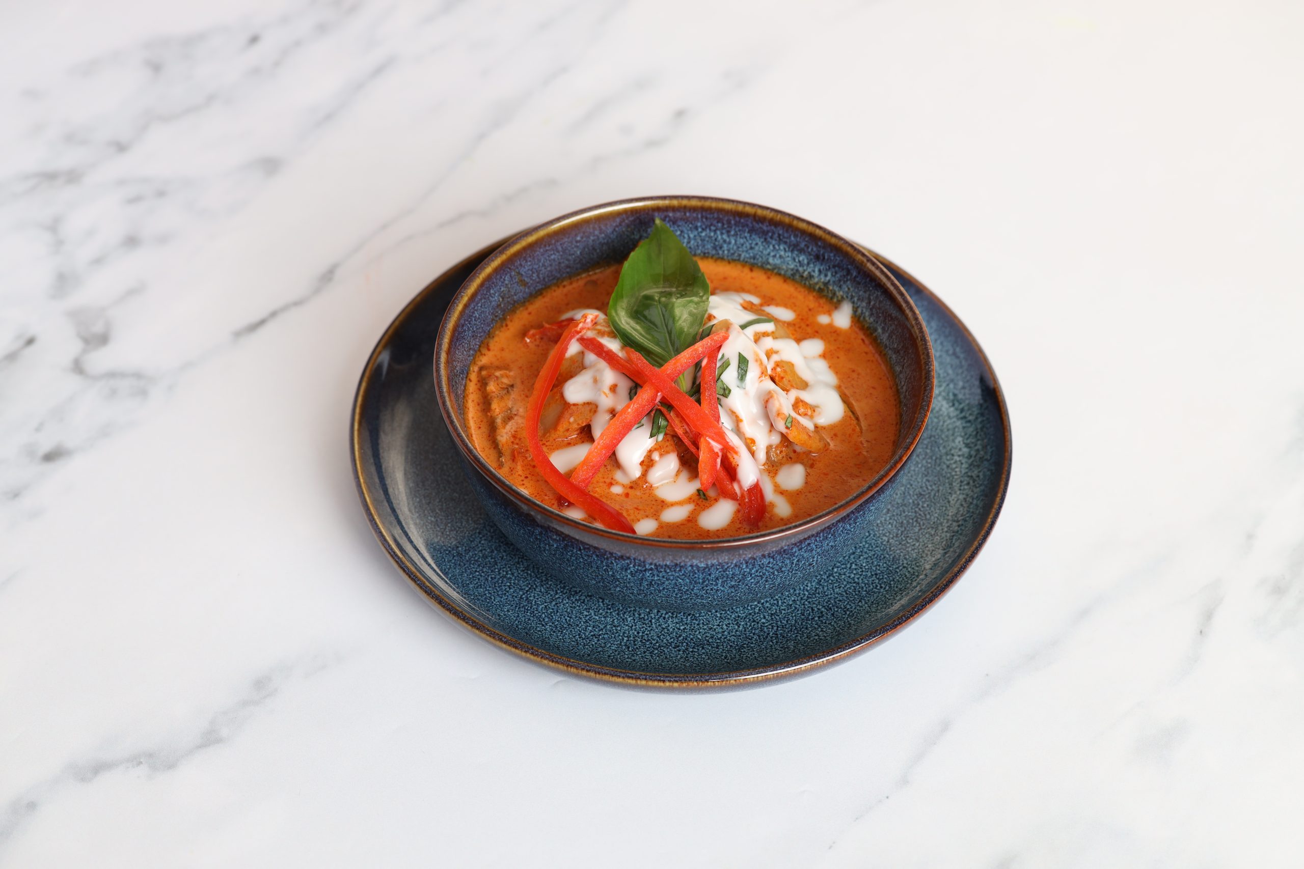 The red curry cooked with green, red curry paste in coconut milk, with bamboo shoots, aubergines, red peppers, and Thai basil, your choice of meat: (Medium Hot)